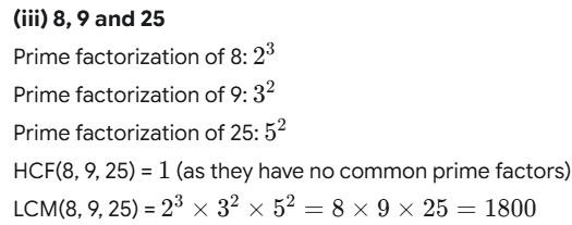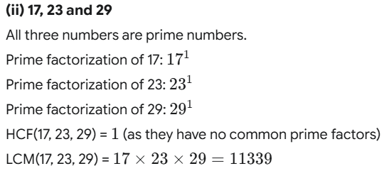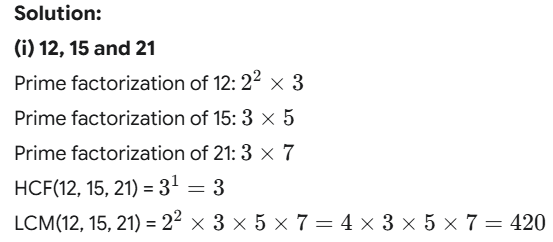 Question 3. Find the LCM and HCF of the following integers by applying the prime factorization method. (i) 12, 15 and 21 (ii) 17, 23 and 29 (iii) 8, 9 and 25