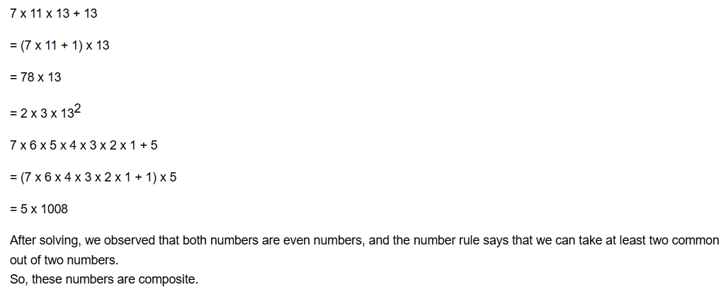 Q6. Explain why 7 × 11 × 13 + 13 and 7 × 6 × 5 × 4 × 3 × 2 × 1 + 5 are composite numbers.