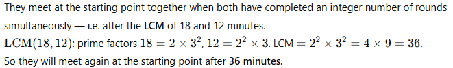 Q7. There is a circular path around a sports field. Sonia takes 18 minutes to drive one round of the field, while Ravi takes 12 minutes for the same. Suppose they both start at the same point and at the same time, and go in the same direction. After how many minutes will they meet again at the starting point?